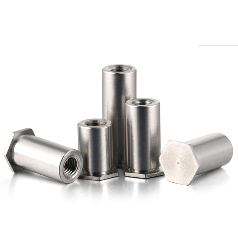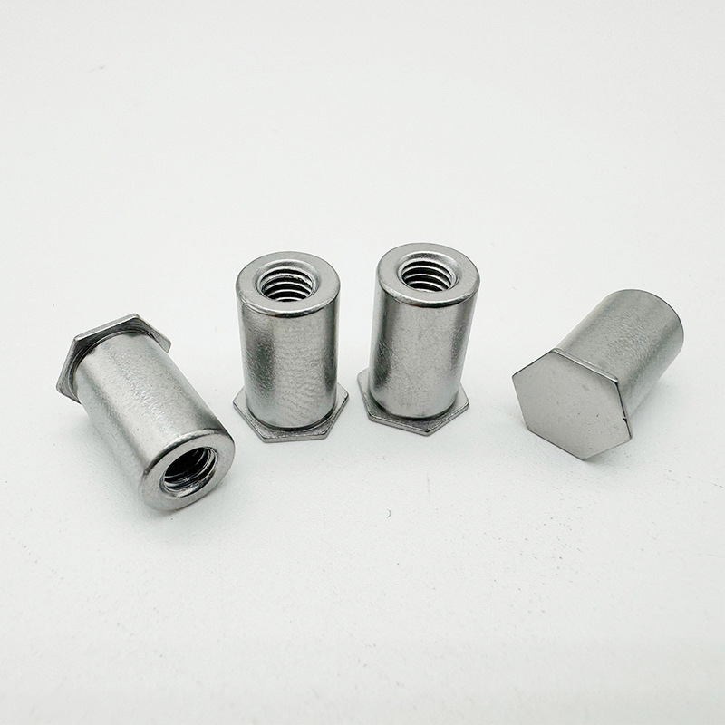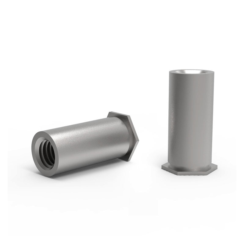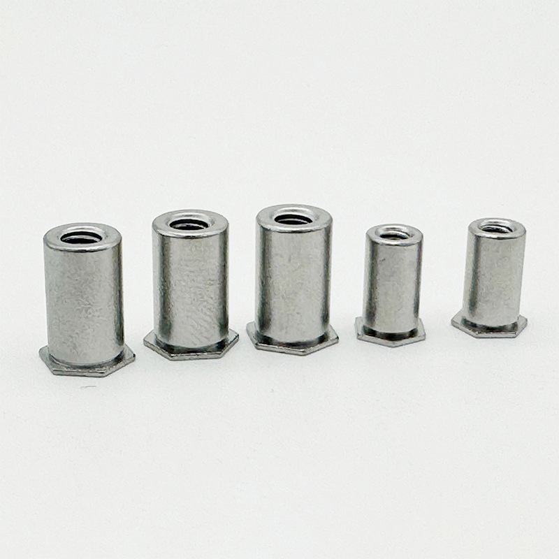 Сляпа дупка плоска глава с шестоъгълна гайка е закопчалка, подходяща за тънки материали. Той е силен и издръжлив, а нишката не е лесна за носене. Той има шестнадесетна форма за лесна инсталация, плоска глава на въртящия се, която седи зачервяване, и орехово тяло със със със със затворен сляп отвор от затворен тип. Когато го инсталирате, гайката се деформира механично (като нитове), за да се заключи върху материала.