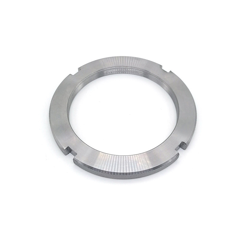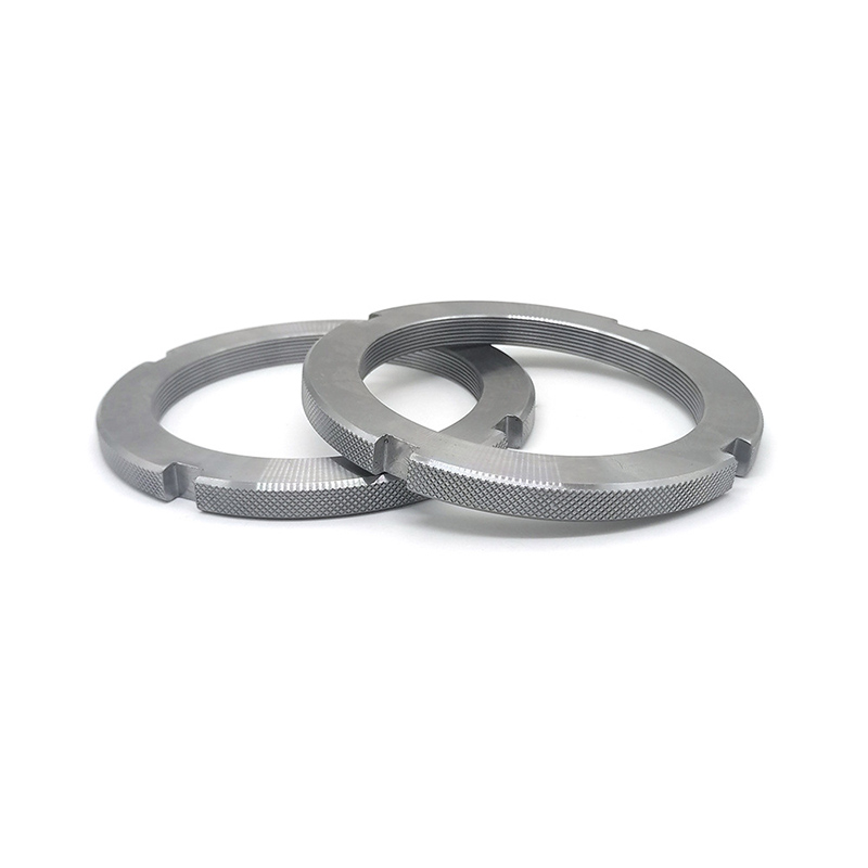 Кръгли гайки с шлицове с пълна резба - те са определени съгласно стандарти като DIN 546 и се използват главно за постигане на сигурна връзка за закрепване и могат да издържат на вибрации. Основната характеристика на тези гайки се крие в слотовете, изрязани в единия край на гайката. Ето как да ги използвате: Първо завийте гайката върху предварително пробит болт или шпилка и я затегнете до желаната позиция. След затягане подравнете слота с отвора на вала на болта. Накрая поставете отворен щифт (заключваща шайба) или предпазно въже през подравнения слот и отвора на болта и след това огънете краищата на щифта, за да осигурите здраво закрепване. Така при наличие на вибрации гайката няма да се разхлаби.