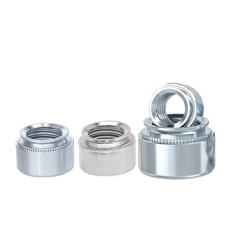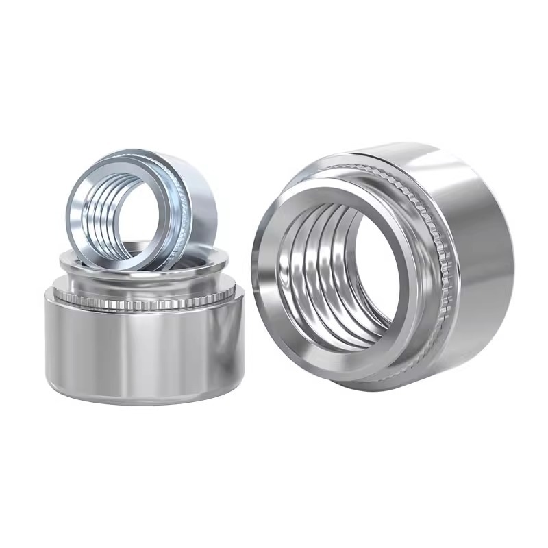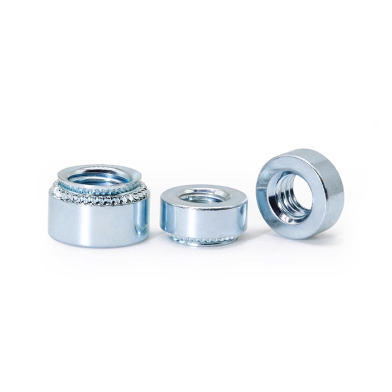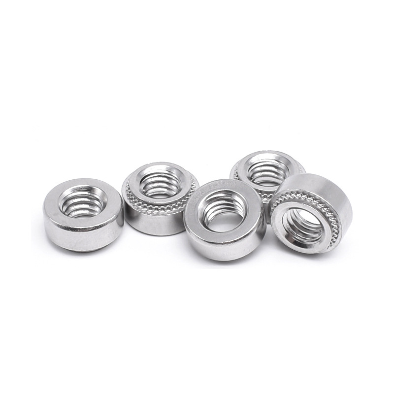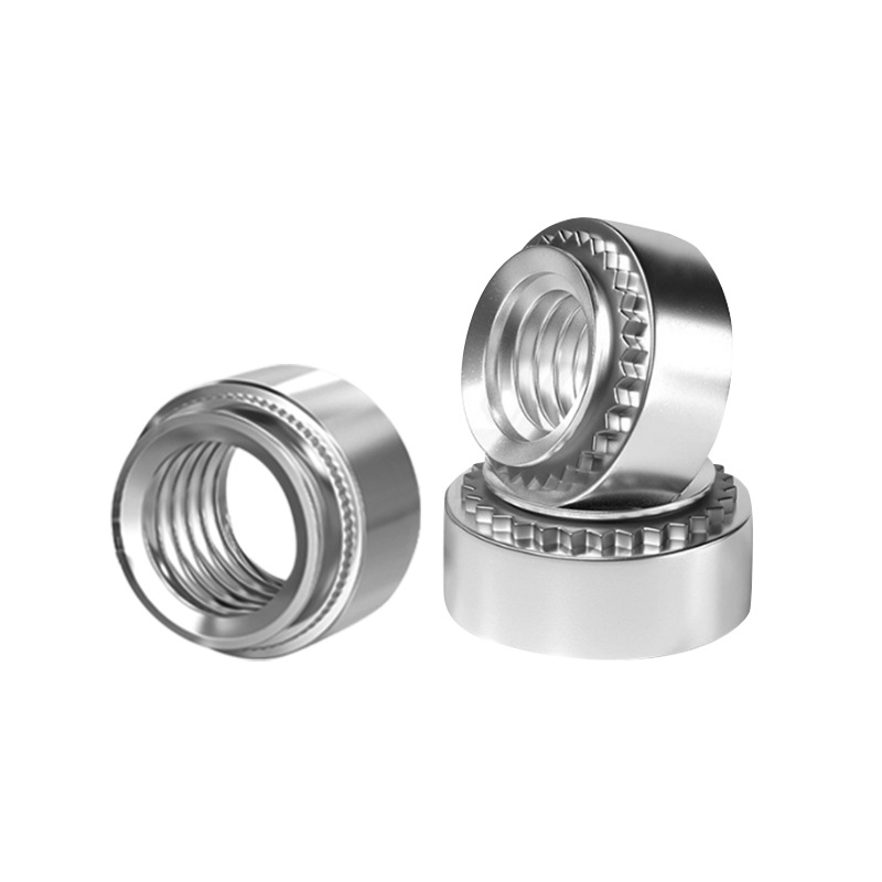 Основното нещо за постоянната гайка за клиниране е, че той може да образува постоянна, силна връзка директно в пластични ламарини или невъоръжени плочи, без да се нуждаят от предварително пробити нишки. Когато го инсталирате, пресата натиска постоянната гайка за притискане в материала. Специфичната му форма кара метала около него да се движи и да се движи в отстъп във формата на пръстен (като knurl или жлеб) под главата и/или около копая.