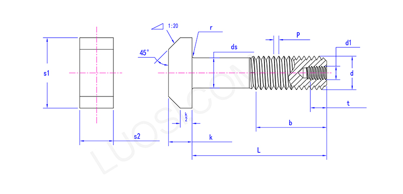 Главата на редуцирания болт на Shank T с дупка е подобна на ромб и може да се забие в T-слота, за да бъде фиксиран и да не се върти. Средната част на неговия винт е станала по -тънка, тоест "свита пръчка", а на дъното на винта също е пробита дупка. Интериорът е кухи.