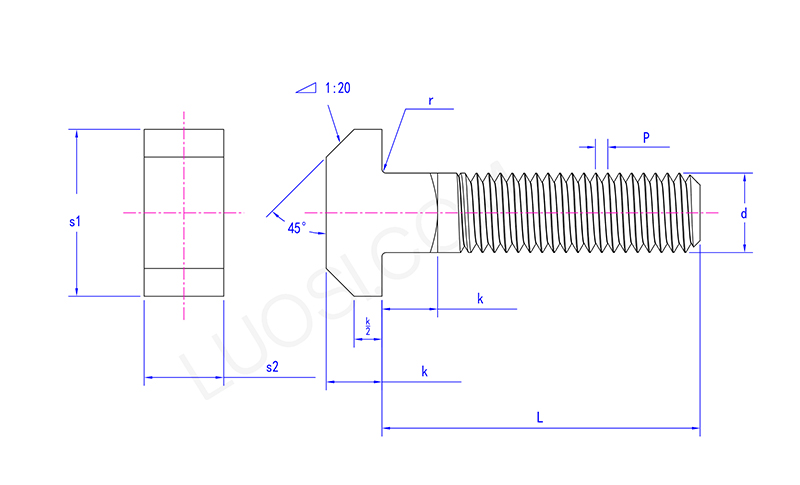 Главата на болта на квадратния ший T е хоризонтално поставена "T" форма, точно както буквата "T". Тази широка Т-образна глава позволява болта да се забие в Т-образната жлеба на оборудването, играейки роля за предотвратяване на издърпването на болта.