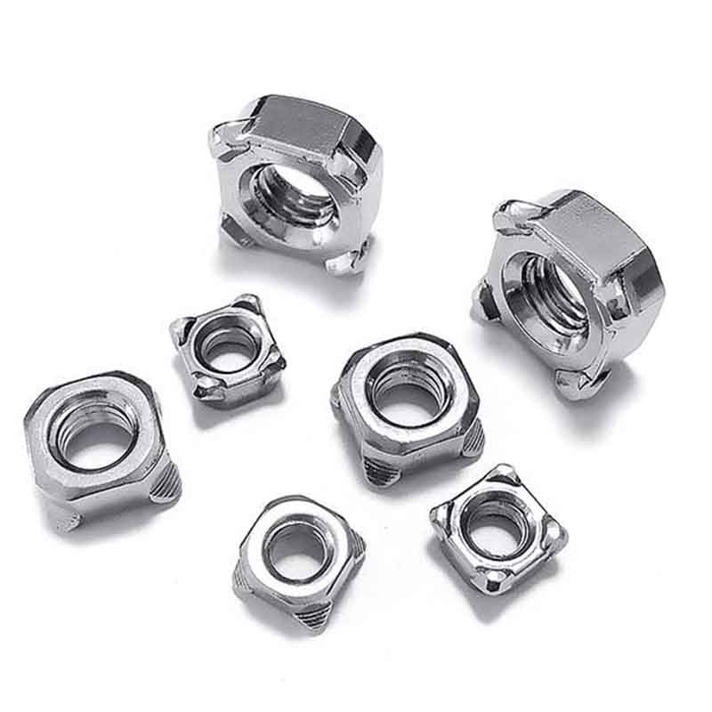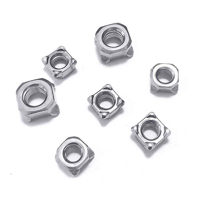 Квадратните заварени гайки тип B са в квадратна форма като цяло. Те имат отвори с резба в средата и всеки от четирите ъгъла има малка издатина, която е специално проектирана за заваръчни цели. От M4 до M12 всички са налични и се предоставят и съответните болтове.